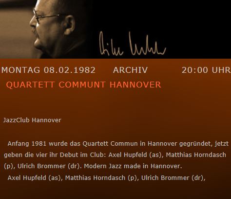 "Quartett Commun" 1982: von links nach rechts: selbst (as), Matthias Horndasch (p, verstorben am 2. Dezember 2015), Jürgen Attig (bs), Ulli Brommer (dr)