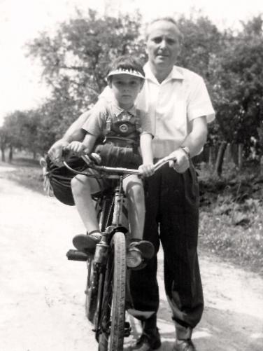 Mein Vater hat mich mit dem "Fahrradvirus" infiziert. Er ist im wahrsten Sinne gut damit gefahren, denn noch bis ins hohe Alter hat er sich täglich auf sein Fahrrad geschwungen, und er ist fast 96 Jahre alt geworden. Hier sind wir 1957 gemeinsam in der Gegend um den Hohen Meißner in Nordhessen unterwegs.