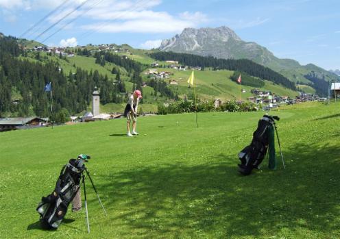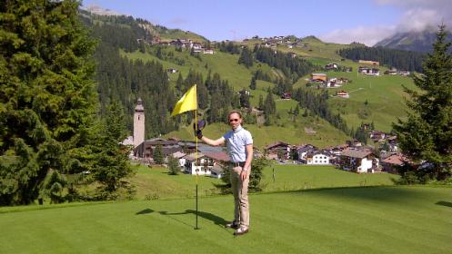 Nicoletta auf dem Grün vor schönster Alpenkulisse in Lech am Arlberg im Juli 2011