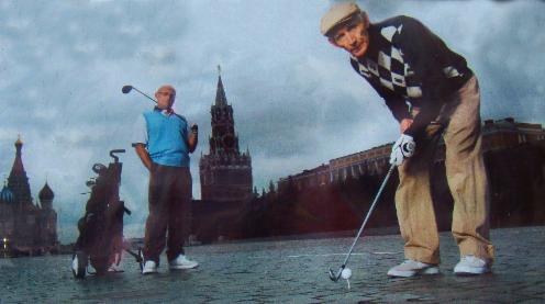 Ein überraschendes Angebot von „Golf House“ im GUM gegenüber dem Kreml, dunkle Wolken und Nieselregen, aber die Jungs aus meinem spontan zusammengestellten Flight waren gut drauf: Igor (76, rechts), in den 50er Jahren Teaching Pro bei Fidel Castro, seit langem aber ohne eigene Ausrüstung, lieh sich ein 7er Eisen (!) von Fjodor (links, mit vollem Callaway-Satz - von seinem Ostberliner Schwager ausgemustert), teete unter heftigen Rückenschmerzen auf und schlug dann aber dank unglaublicher Schwungtechnik (gelernt ist gelernt!) ab bis zum Auferstehungstor, während der arrogante Fjodor seinen schönen Big-Bertha-Driver kurz nach diesem Schnappschuss voll auf’s Pflaster des Roten Platzes knallte.
